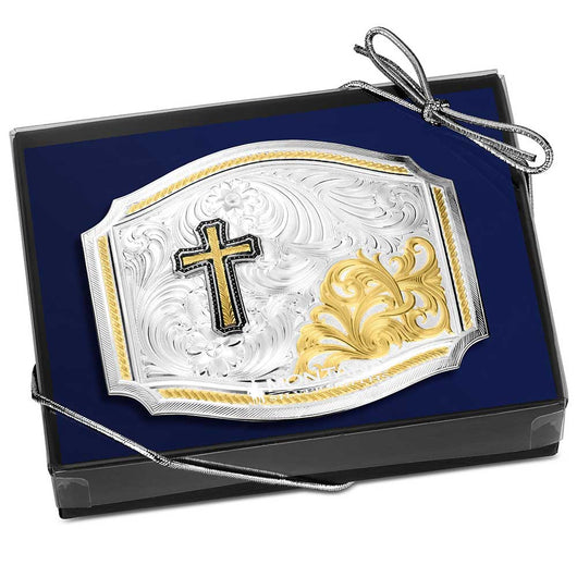 This uniquely curved square buckle features intricate bright cut silver engraving throughout, framed by a rich gold tone rope edge for timeless Western style. Our large cross figure makes a statement while a bold golden filigree accent in the lower corner adds eye catching contrast and refined charm. Standard 1.5 inch swivel.